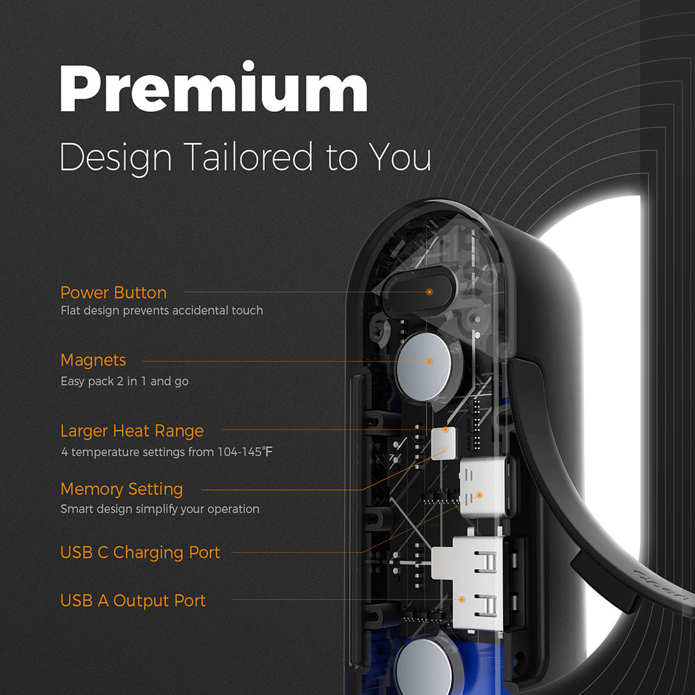 With MagTwins, you no longer have to worry about the cold, bulky equipment, numb hands – warmth can be at your fingertips anywhere! Fits like a glove! The UT2s model perfectly adapts to the shape of your palms, delivering a pleasant sensation that will rejuvenate your upper limbs. Compact, magnetic, powerful. Advanced technology allows temperature adjustment according to your preferences, offering you various options for increased comfort. Specifications: Material: aluminum; Connector: Type-C; Battery capacity: 2x 5000mAh; Operating time: 8 hours; Charging time: 3 hours; Number of heat levels: 4; Operating temperature: 38° - 58°C; Dimensions: 9.4 x 3.1 x 2.9cm; Weight: 225g.