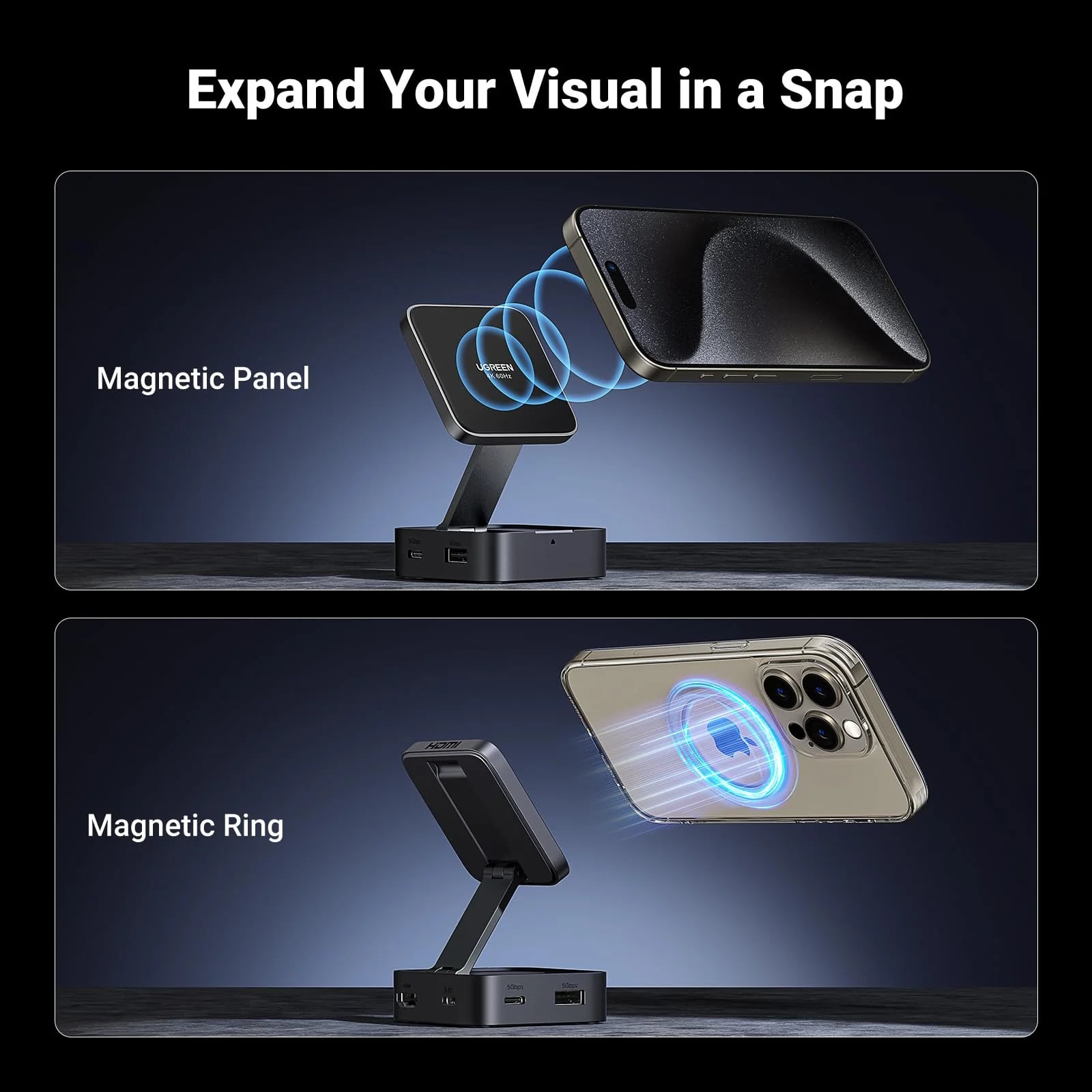 Equipped with a strong 9N magnetic system and a dedicated magnetic ring, the hub firmly and securely attaches to compatible devices,