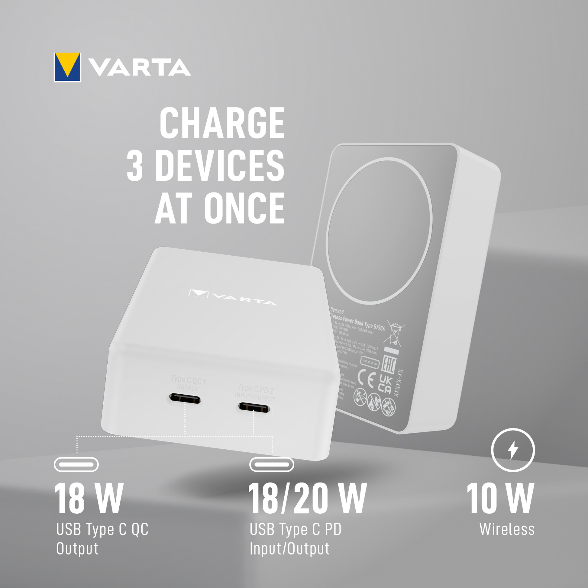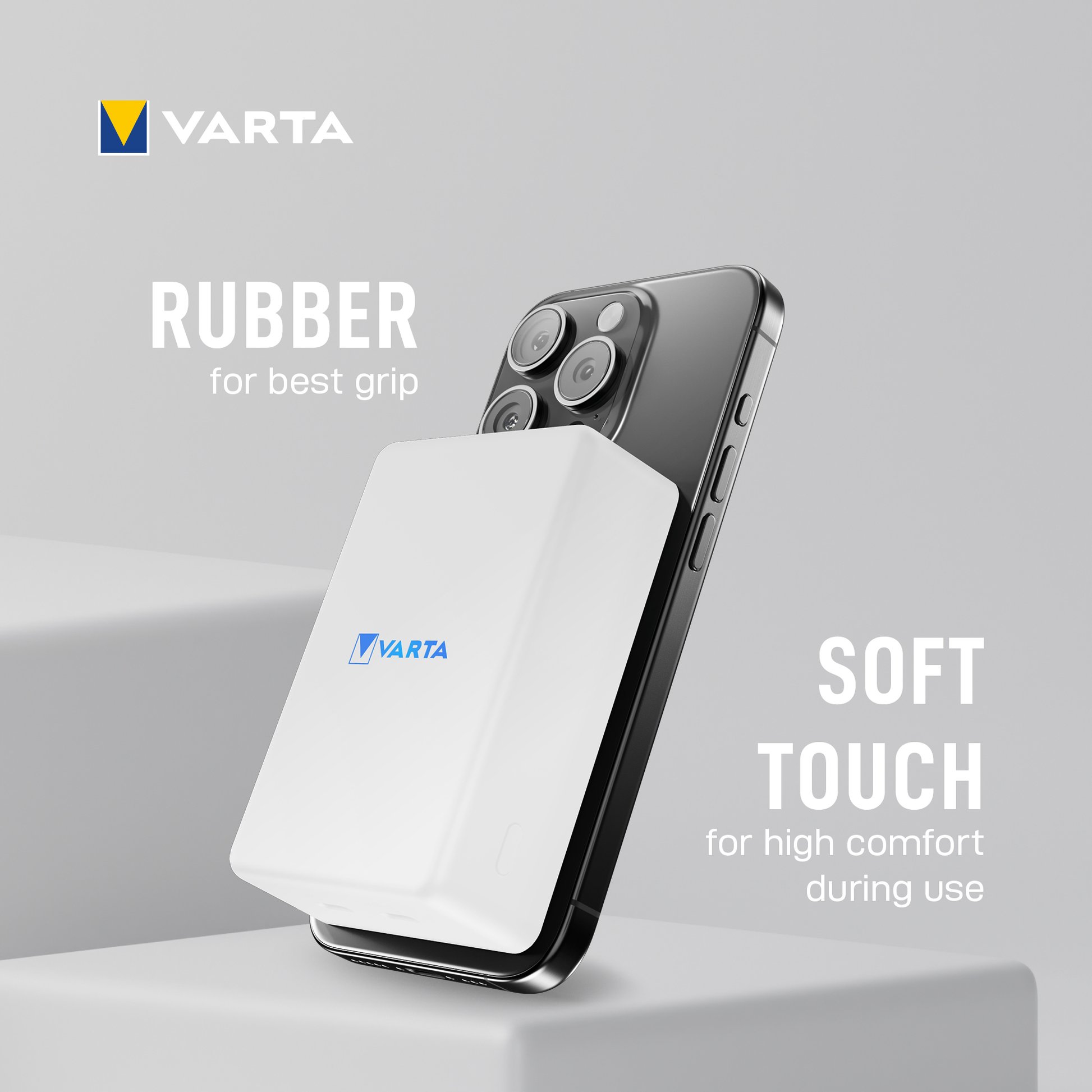 Magnetic technology allows for quick and secure attachment, ensuring perfect alignment between device and battery. The soft touch textured surface provides high comfort, and the illuminated VARTA logo indicates the remaining charge level. Ideal for simultaneous charging,