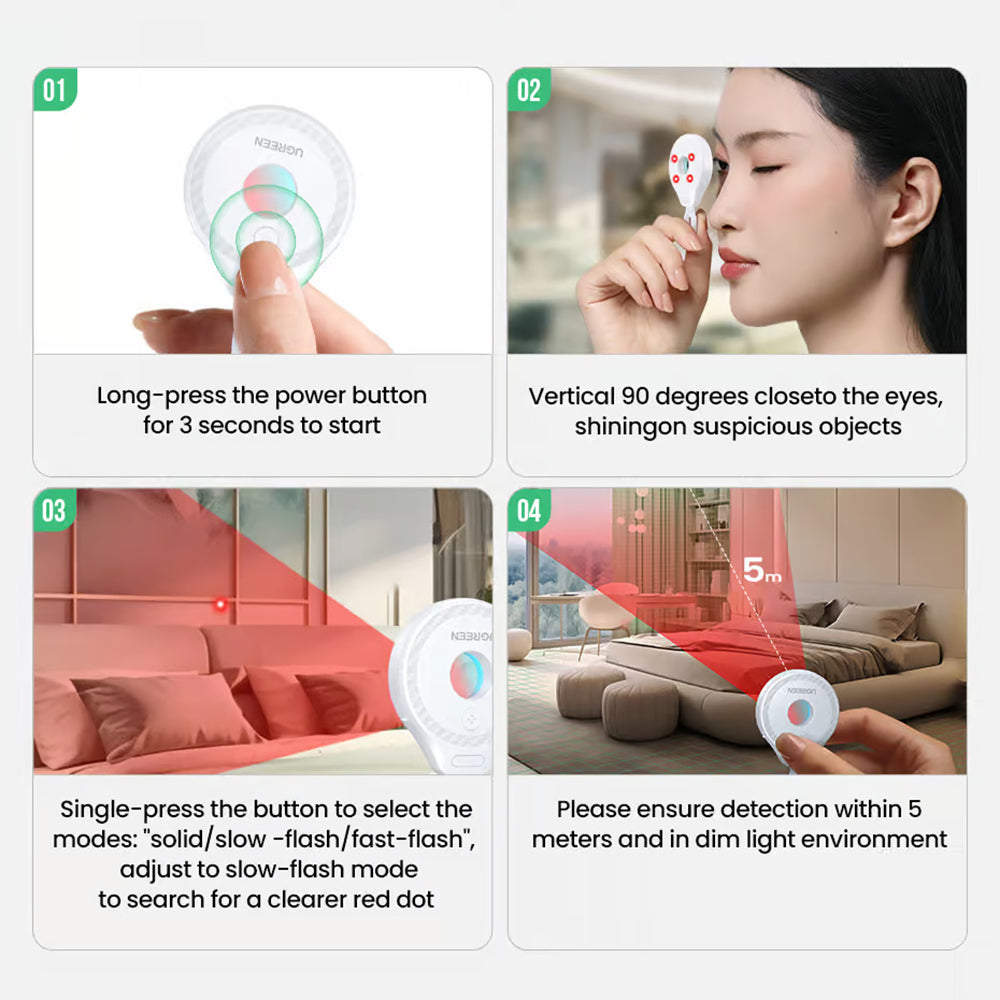 Detektor Ugreen rýchlo identifikuje špionážne kamery a ďalšie skryté dohľadové zariadenia, poskytujúc bezpečnosť v hoteloch alebo prenajatých priestoroch.